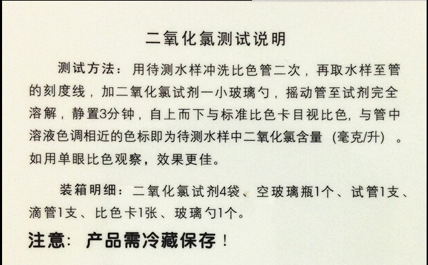 ●装箱明细:余氯试剂2瓶、试管1支、滴管1支、比色卡1张。